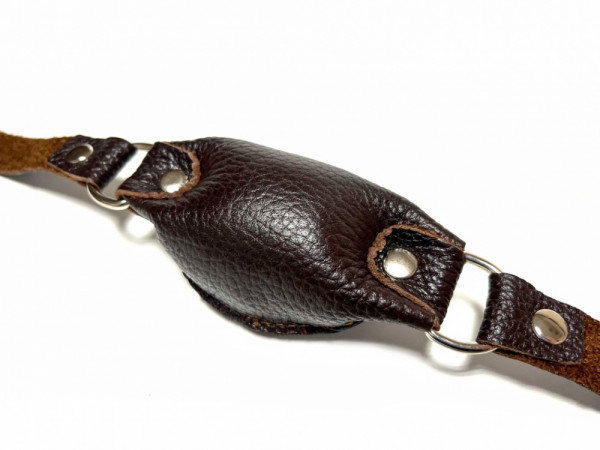 Застегивается при помощи металлического замка на затылке. Ремешок также выполнен из натуральной кожи