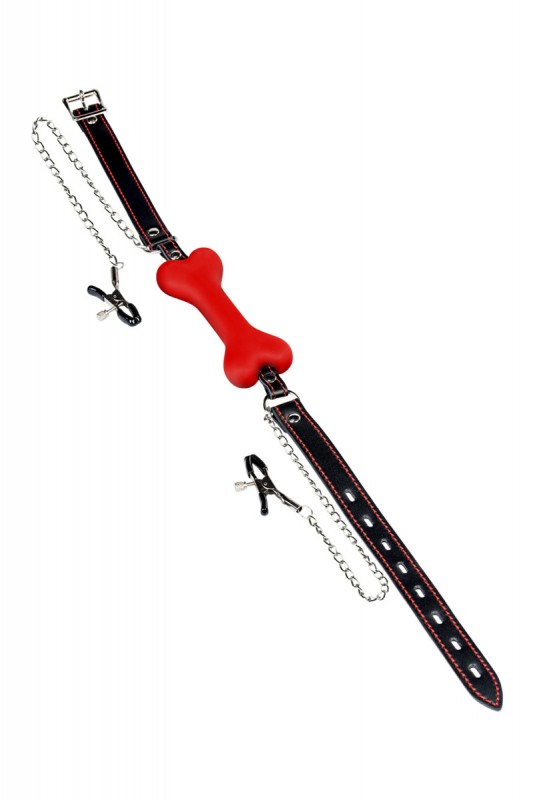 К кляпу при помощи металлических цепочек присоединены зажимы для сосков. Зажимы регулируемые, что позволяет самостоятельно регулировать степень сжатия. Силиконовые наконечники идеальны для самых комфортных ласк, т.к. не натирают и не царапают нежнейшую кожу