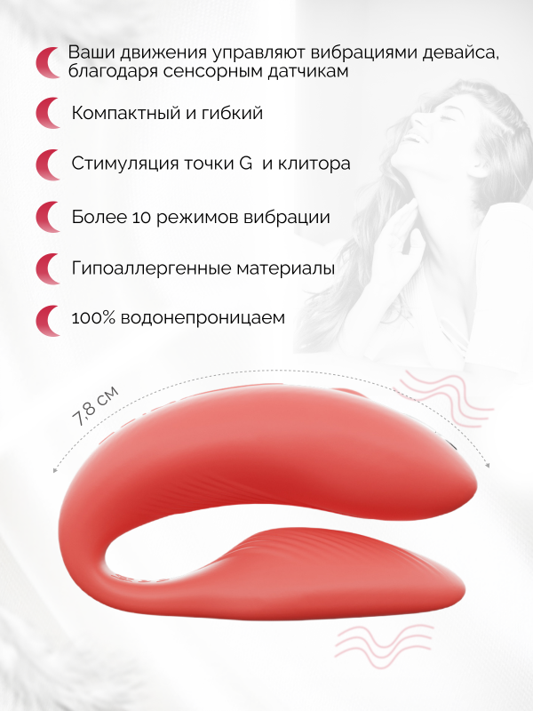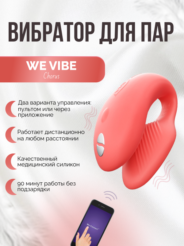 "We-​Vibe Chorus" поз­во­лит добиться мак­симально точеч­ной стиму­ляции своих сокро­вен­ных точек, он сги­ба­ется так, как Вам необ­хо­димо и поз­во­ляет регу­ли­ро­вать и кли­то­раль­ный, и ваги­наль­ный отро­сток! Теперь Вы выби­ра­ете с большим, либо меньшим дав­ле­нием стиму­ли­ро­вать свои эро­ген­ные зоны!